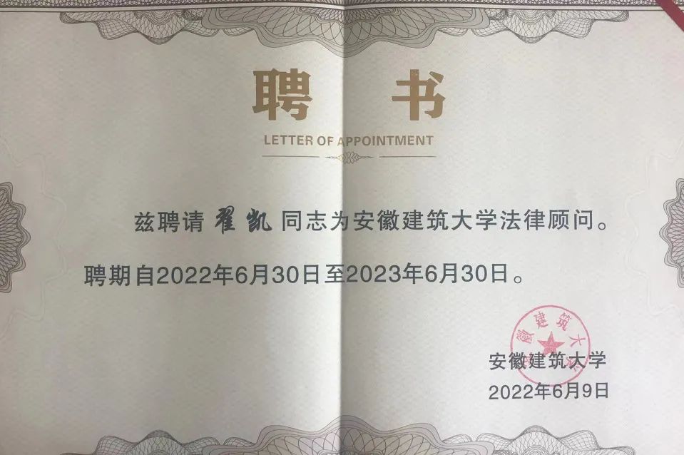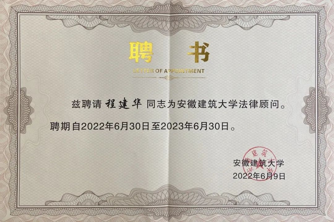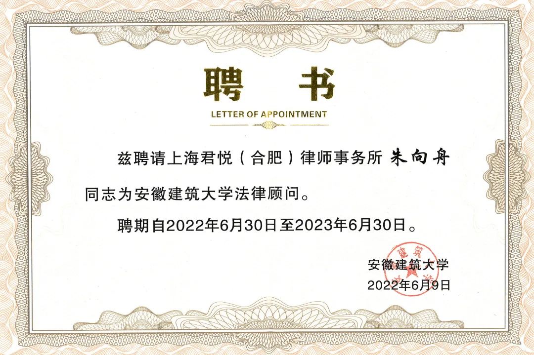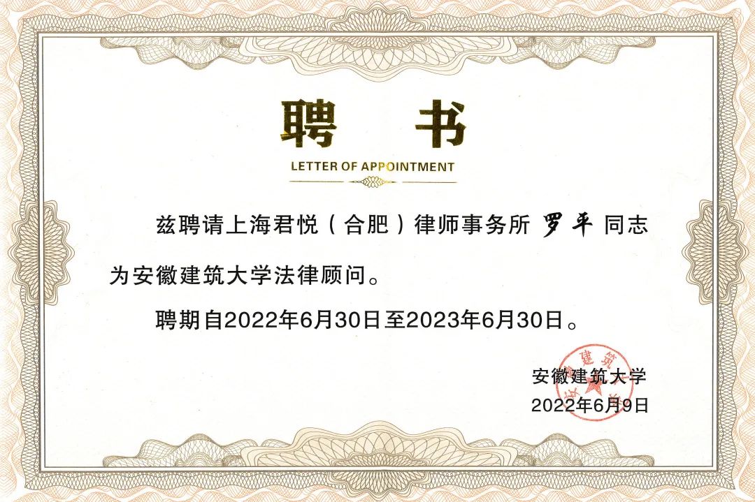 君悦(合肥)律师事务所(简称“君悦律所”或“本所”)主任罗平,行政副主任朱向舟,安徽建筑大学教授、本所兼职律师程建华博士,安徽建筑大学讲师、本所兼职律师翟凯博士同时受聘安徽建筑大学法律顾问。