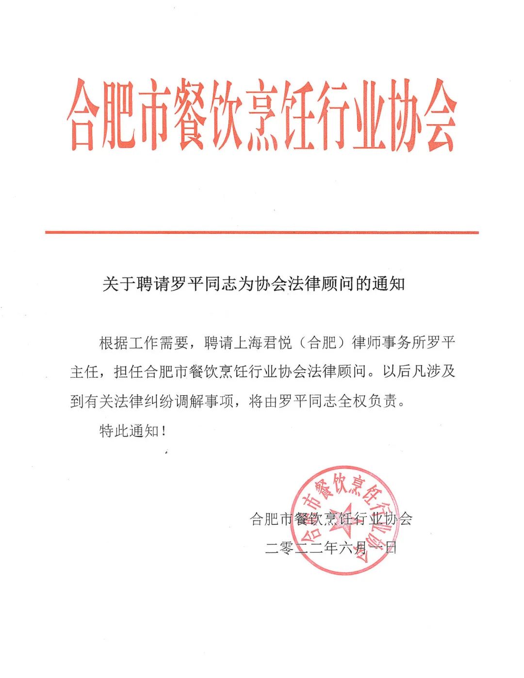 近日,合肥市餐饮烹饪行业协会经研究决定聘任君悦(合肥)律师事务所主任罗平为协会法律顾问。
