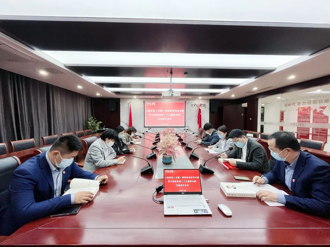 2022年11月2日下午,上海君悦(合肥)律师事务所党支部在党建会议室召开专题会议,传达学习贯彻习近平总书记重要讲话精神,学习贯彻中共中央关于认真学习宣传贯彻党的二十大精神的决定,研究贯彻落实意见。