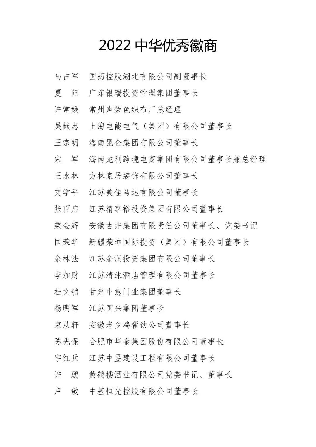 其中“2022年度中华百名优秀徽商”榜单公布如下: