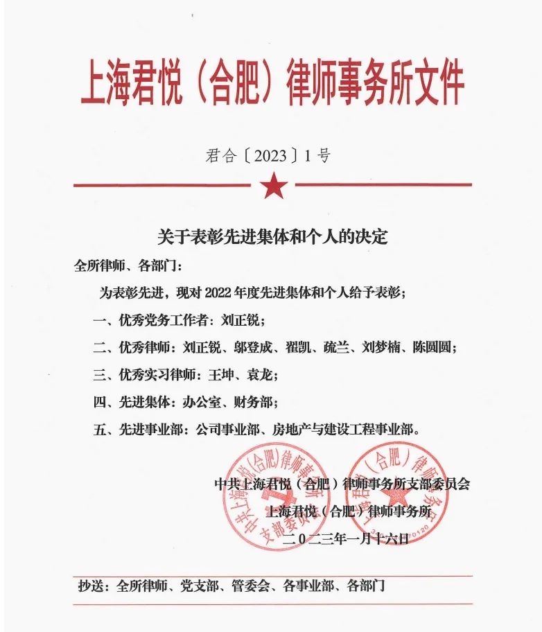 君悦合肥关于表彰2022年度先进集体和个人的决定