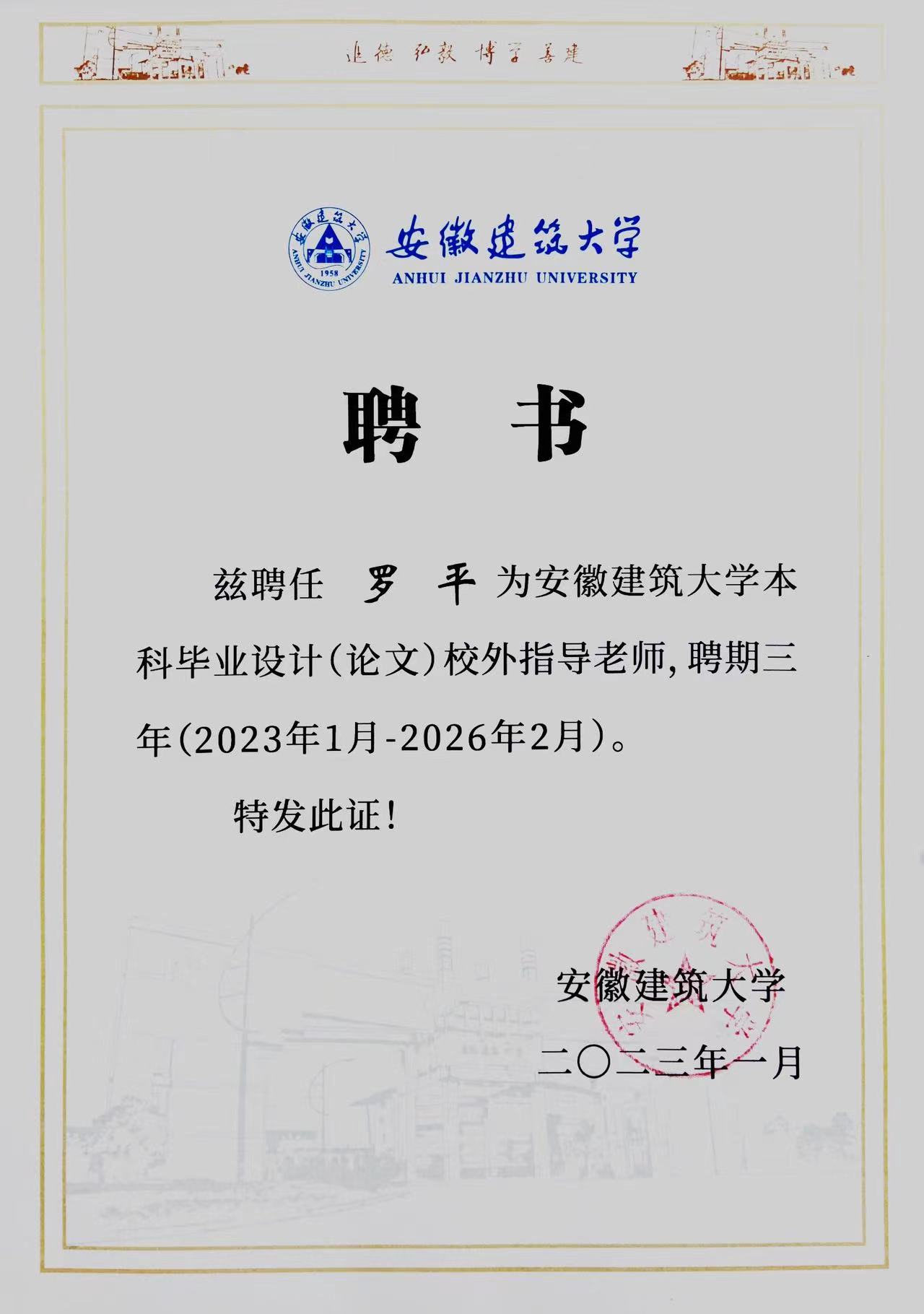 日前,安徽建筑大学颁发聘书,聘任上海君悦(合肥)律师事务所主任罗平为安徽建筑大学本科毕业设计(论文)校外指导老师,为安徽建筑大学本科毕业生毕业论文提供指导工作。 罗平主任目前担任安徽建筑大学法律顾问、兼职教授,硕导。 罗平主任还在安徽大学、浙江理工大学、安徽财经大学、安徽警官学院等高校担任学术职务。