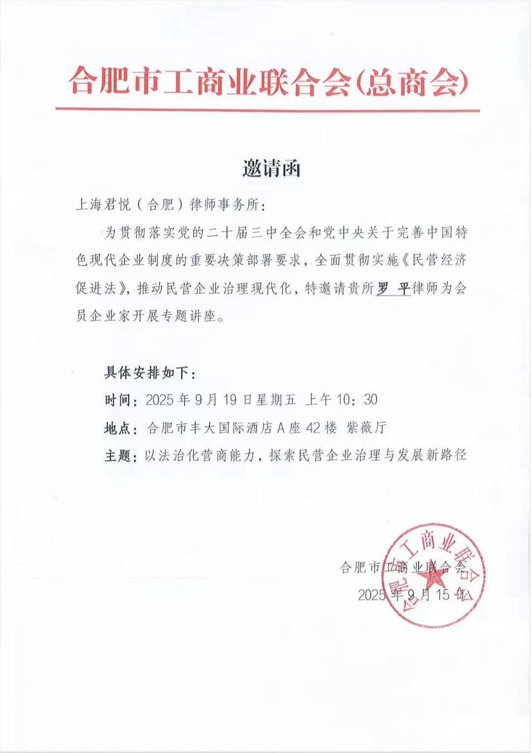 近日,应合肥市工商联邀请,市工商联执委、上海君悦(合肥)律师事务所主任罗平为合肥市工商联会员企业家开展《以法治化营商能力,探索民营企业治理与发展新路径》专题授课活动。 罗平主任的专题授课受到与会企业家积极评价。