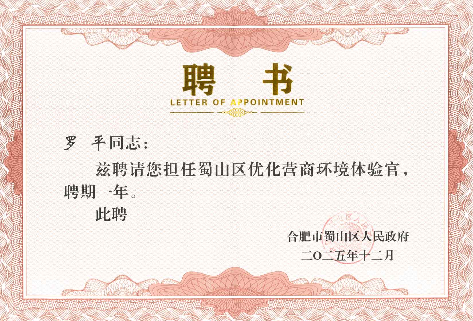 2025年12月9日下午,合肥市蜀山区人民政府组织召开全区优化民营经济发展环境工作座谈暨第二批优化营商环境体验官聘任会议。 区委常委、组织部长、统战部长、区政协党组副书记张金平,区委常委、副区长邓会勇,区政府副区长、党组成员吴腾等出席会议。 君悦(合肥)律师事务所主任罗平受聘为合肥市蜀山区人民政府营商环境体验官,并作为受聘唯一法律界人士做大会重点发言。