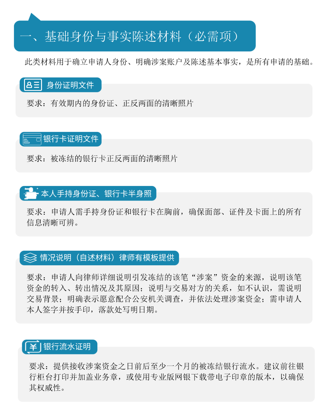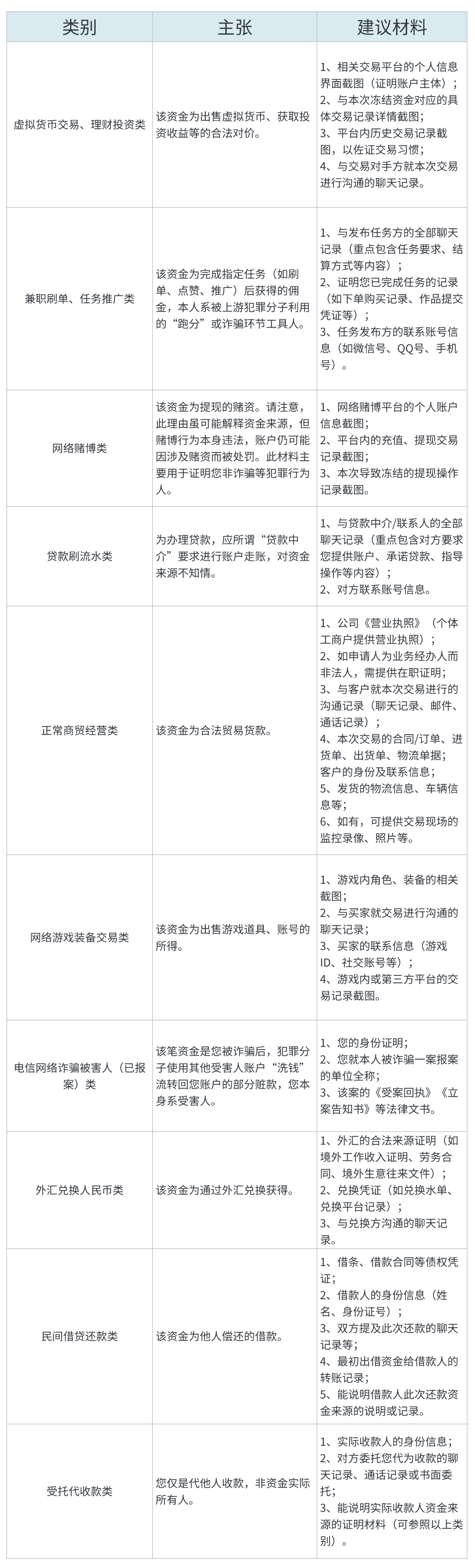 上海君悦(合肥)律师事务所聂挺律师团队根据以往代理银行卡解冻业务的实务经验,总结出不同资金流入原因(如虚拟货币交易、商贸货款、兼职报酬等)对应需要补充的专项证明材料,形成了本指南以供参考。
